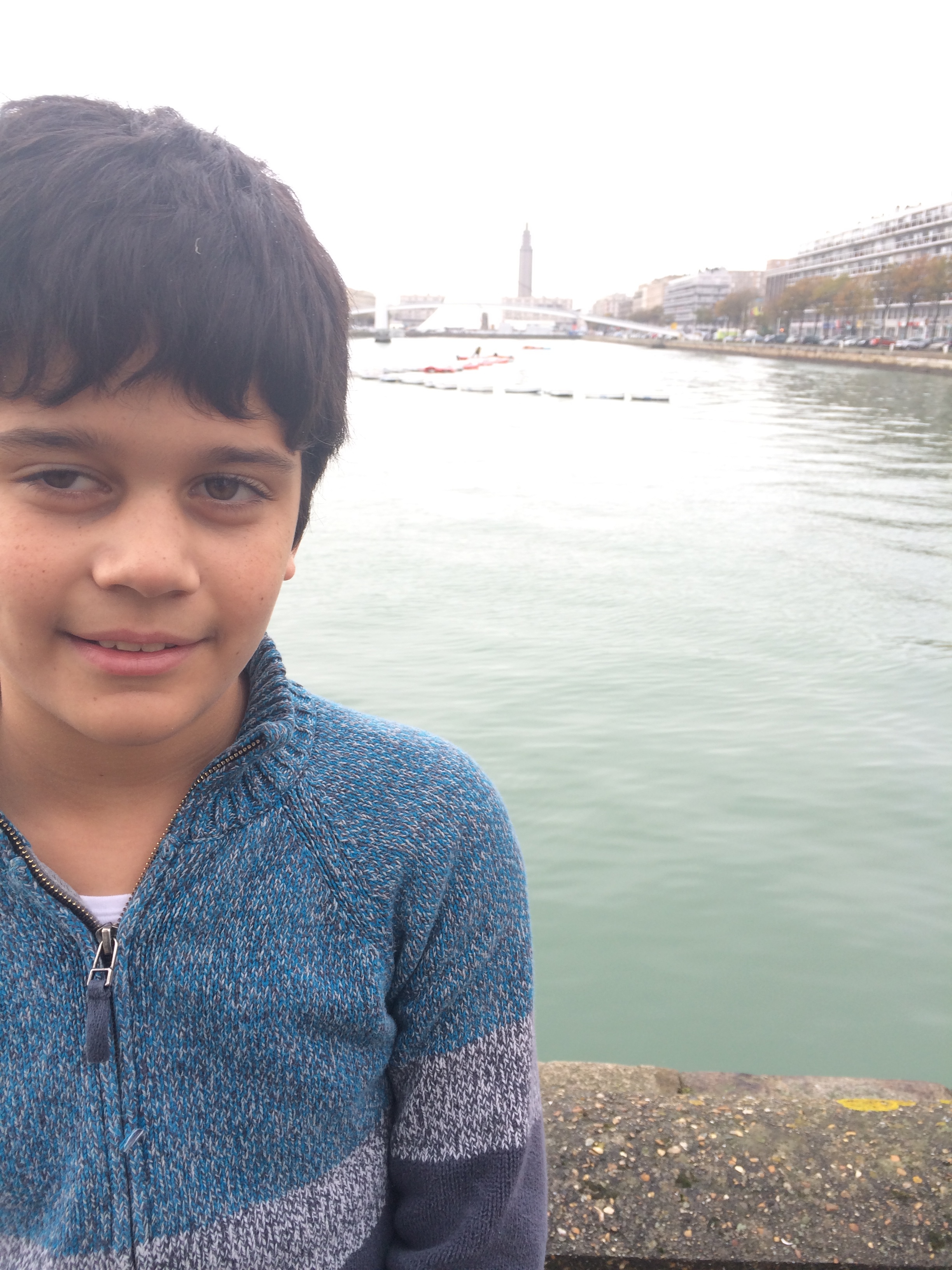 But Curt rarely asks us for things, so we decide the answer is to take a public bus to the other city we could have taken the train to (Caen). So far, two train rides, one bus ride. And we’re still not there. But we realize we’re at the mouth of the Siene and we should find it … (kiddo, not so happy, pictured.)