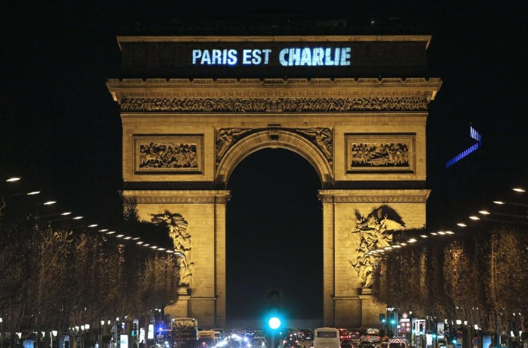Arc de Triomphe (which by the way, has a depiction of La Marseillaise on it). (that’s what that decoration is on each side…) and it said, “Paris est Charlie”. (Paris is Charlie)